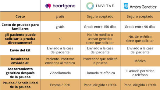 Consulte la tabla comparativa completa de pruebas para obtener más información sobre los detalles de las pruebas de Ambry, Everygene e Invitae.
